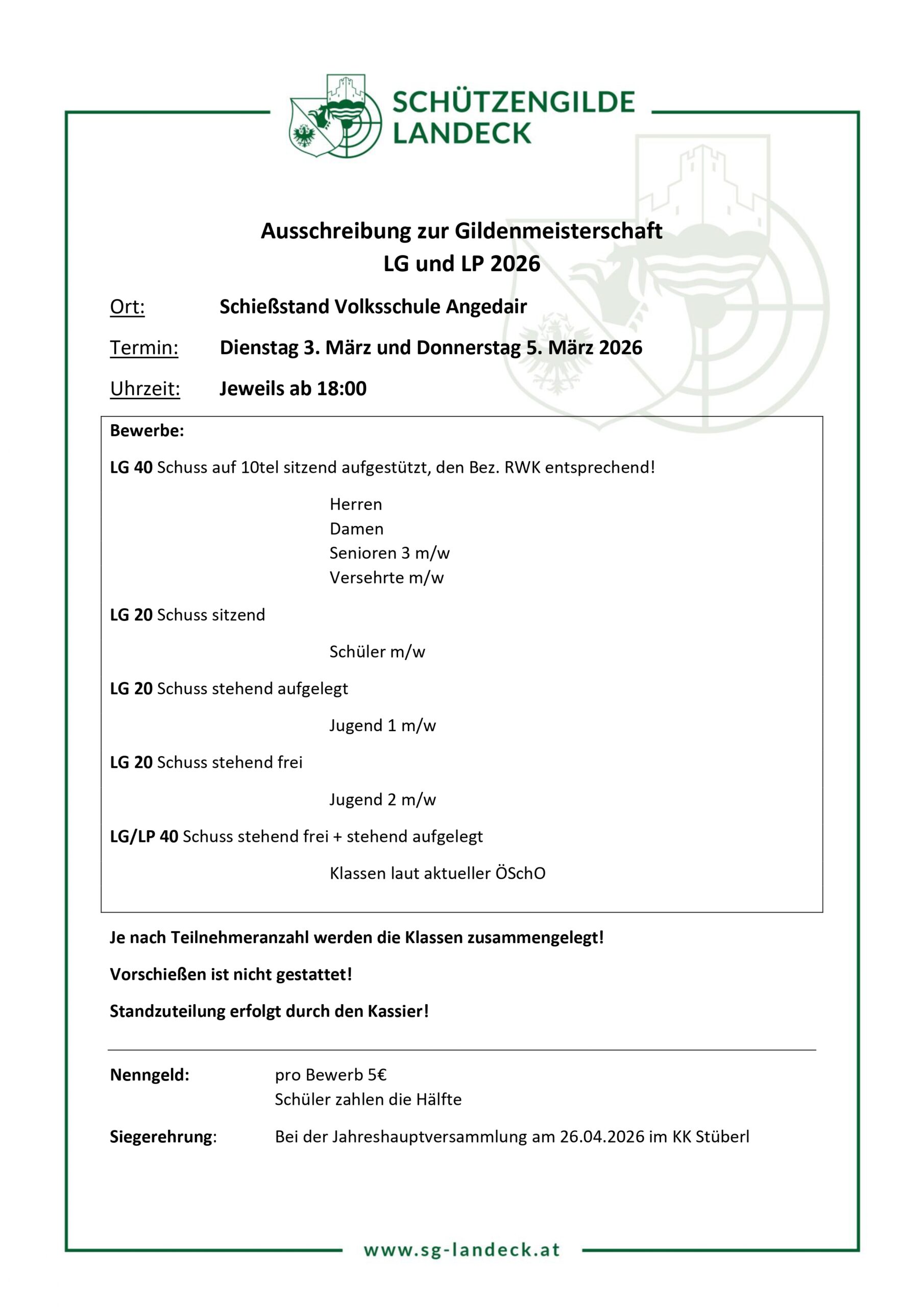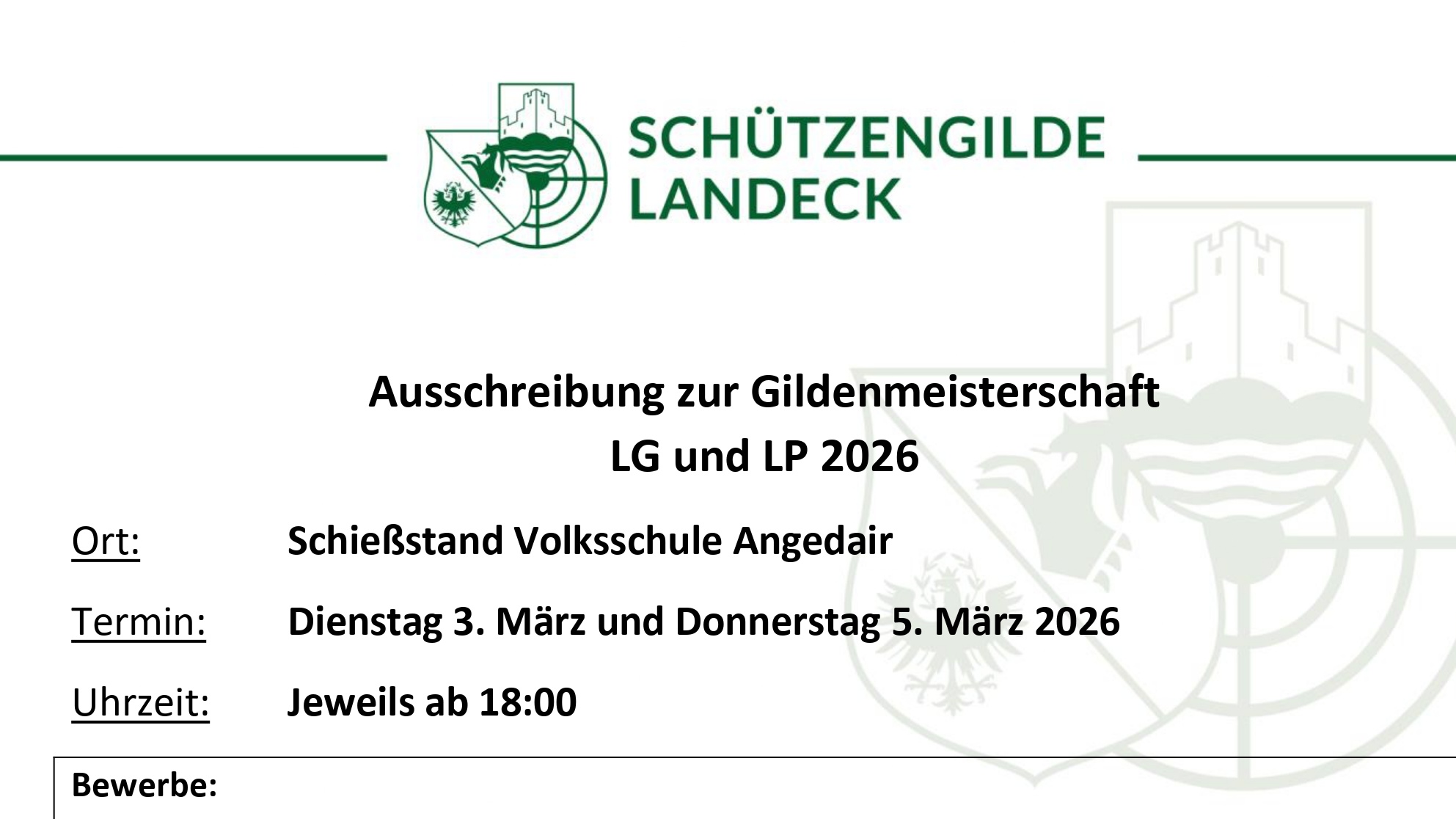 « Alle Veranstaltungen Gildenmeisterschaft Luftdruck 2026 Tag 2 5 März 18:00 - 21:00 « Gildenmeisterschaft Luftdruck 2026 Tag 1 Bottle Challenge 2026 » Download Zum Kalender hinzufügen Google Kalender iCalendar Outlook 365 Outlook Live Details Datum: 5 März Zeit: 18:00 - 21:00 Veranstaltungskategorie: Schützengilde Landeck Veranstalter Schützengilde Landeck Telefon +43 681 10346063 E-Mail vorstand@sg-landeck.at Veranstalter-Website anzeigen Veranstaltungsort Schießstand Volksschule Angedair Schulhausplatz 2 Landeck, Tirol 6500 Austria Google Karte anzeigen